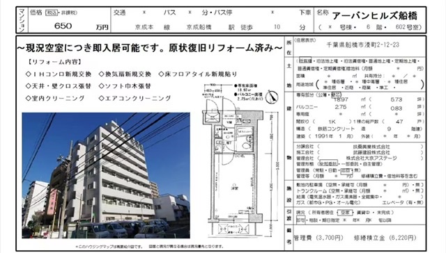 这个1991年钢筋混凝土建造的1K户型的南向高层公寓,距东京千叶县的中心-船桥站步行仅10分钟,有京成线、JR中央总武线、总武快线等多条线路可以利用,每个月的管理修缮费不超过1万日元,售价仅为650万日元(约合34万人民币),月租5万日元左右,租金回报率超过7%。这个价格多年来保持稳定,未来变现也较为容易,是一个较优质的投资项目。