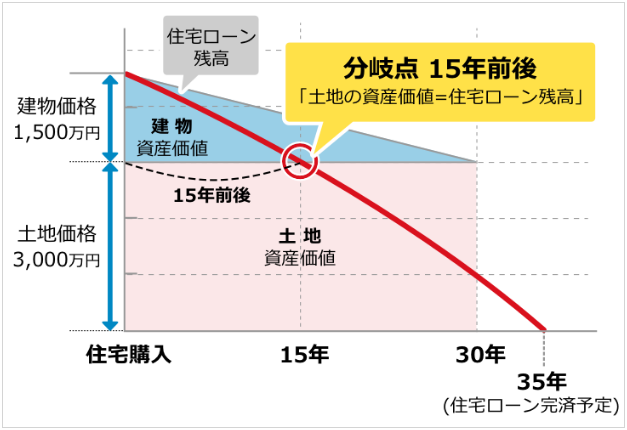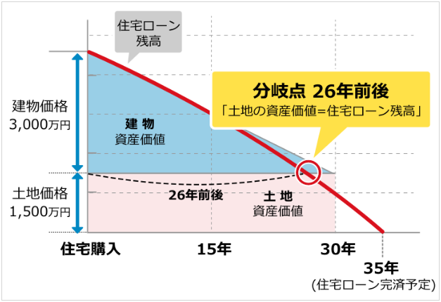 假设在市中心购买了价值4500万日元的房产,其中土地价值3000万及地上建筑1500万,贷款35年,贷款按固定利率2.5%计算。