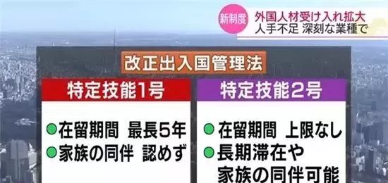 特定技能签证分为1号和2号。其中,特定技能1号是面向「在特定专业领域里,拥有相当程度的知识或者经验的外国劳动者」的签证。签证期最长为5年(每年更新,共计更新5次),需要有三年的实习经验或者日语和相关技能考试合格者,但不能携带家属。通过相关的日语和技能考试,可获得“特定技能2号”签证。