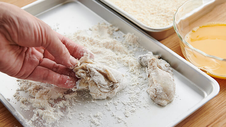 *将每只牡蛎按照面粉、蛋汁、面包粉的顺序裹上面衣。先将鸡蛋打散后,加入一大勺水充分搅拌。在每只牡蛎上涂抹面粉,特别是在皱褶处认真涂抹。然后将牡蛎裹上蛋液,再摆放在面包粉上,让每只牡蛎都充分包裹上面包粉。