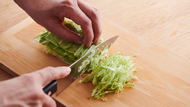 *将圆白菜切成细丝。作为炸牡蛎的配菜,圆白菜丝可以尽量切细。可将菜丝浸泡在冷水中,待坚挺后沥干水分。