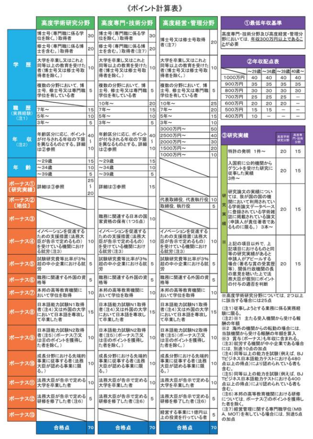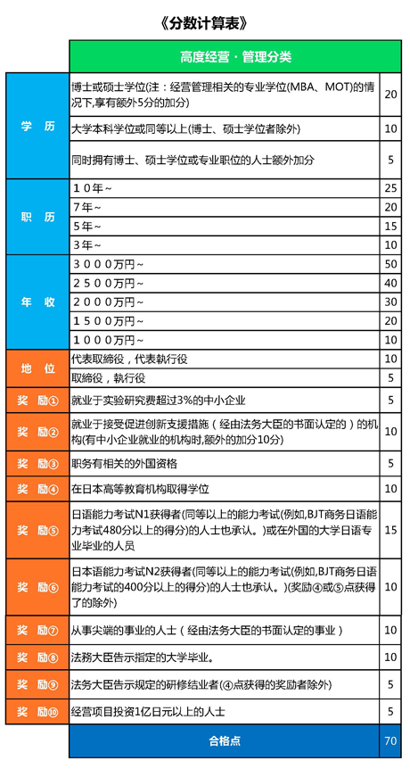 如果年龄超过30岁,在日本没有留过学也没有语言成绩的情况下也没关系,用高收入来平衡就可以。比如在日本所注册的公司经营状况良好,年收入达到3000万日元的话,一下子就可以得到50分了,其他再随便一点加分,达到70分也就不难了。