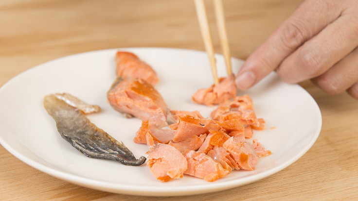 *加热平底锅,无需放油,将鲑鱼两面烤熟。之后去皮剔骨,然后捣成鱼碎。