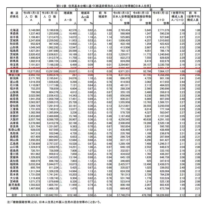 2022年1月1日,日本的人口总数为 125,927,902人,其中日本人为123,223,561人,外国人为2,704,341人。东京人口为13,794,933人,是日本人口最多的城市。如果算上神奈川县、埼玉县及千叶县,东京圈的人口数量是其他都道府县遥不可及的