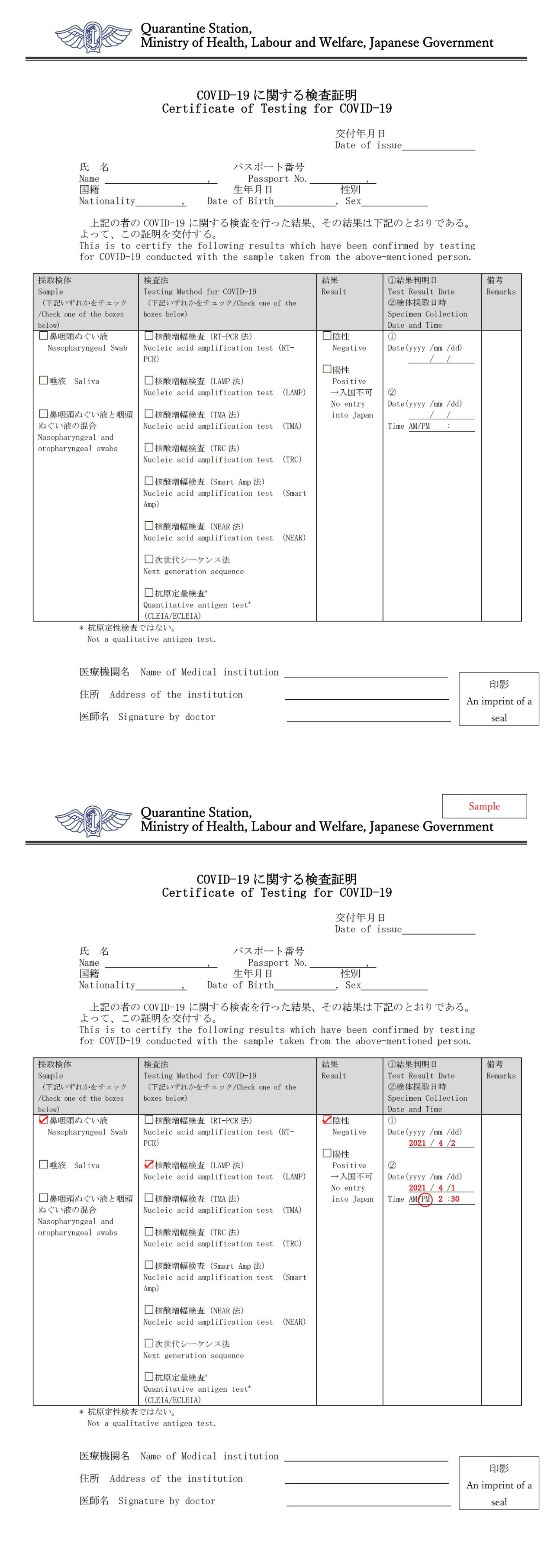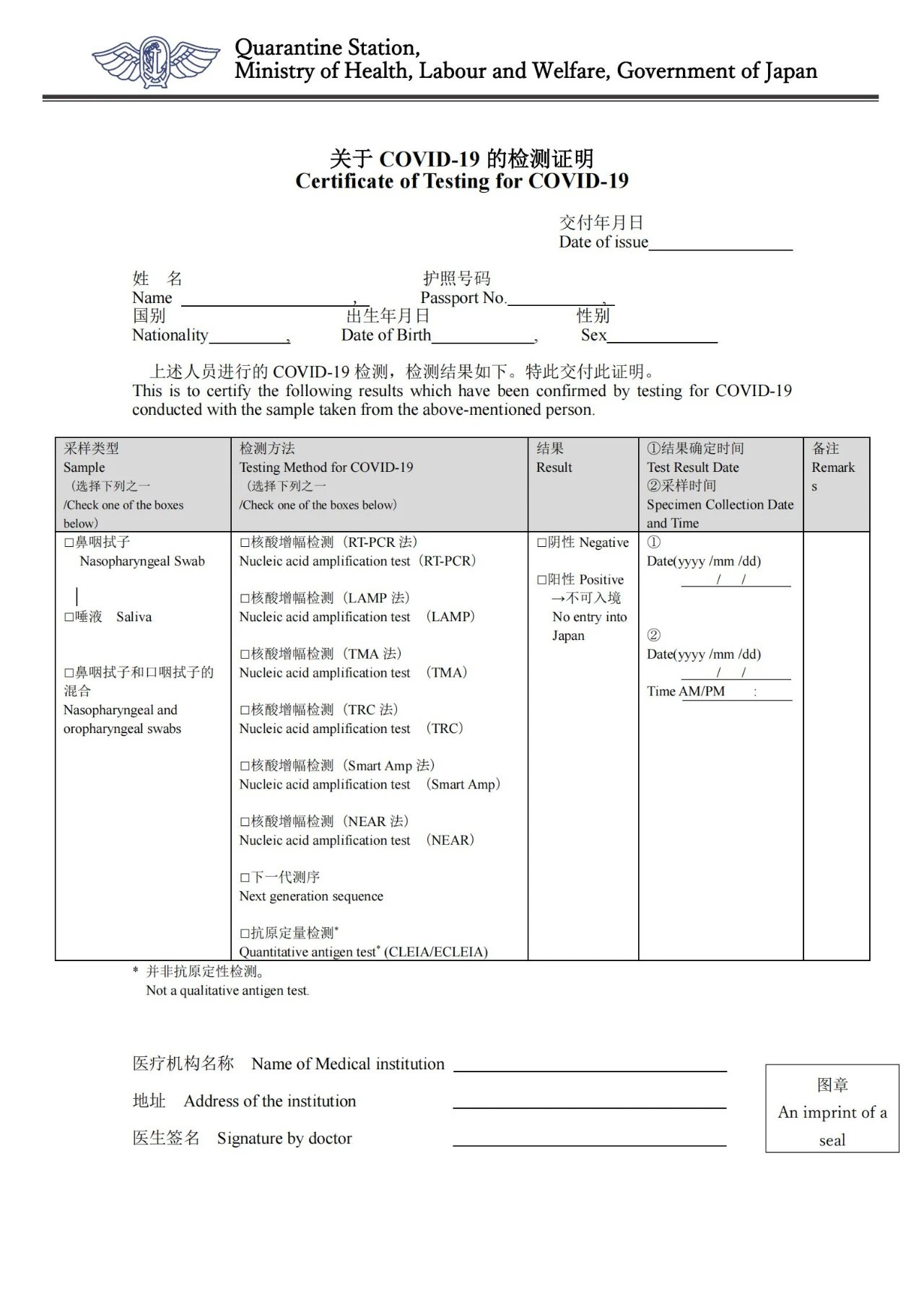 入境日本时也无需隔离,仅需提供被认可的三剂疫苗接种证明或PCR检测72小时内阴性证明即可。72小时阴性证明书(注:从采样到搭乘预定航班出发时刻为止的时间)最好使用英中或日中的符合日本厚生劳动省的指定格式: