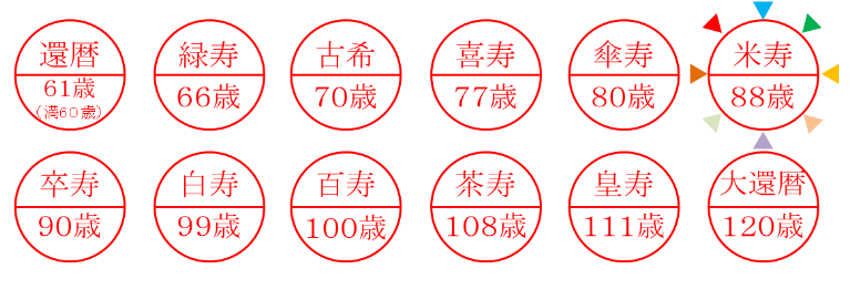 “米”字分解后刚好写成“八、十、八”,因此88岁被形象地成为米寿。一般这个年龄在日本超过了日本人的平均年龄,被当成长寿的象征来庆祝。