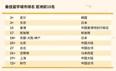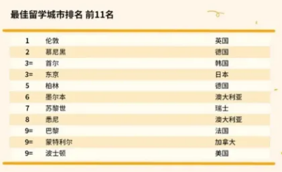 根据全球高等教育和商科教育研究机构(Quacquarelli Symonds) 发布的2022年世界最佳留学城市排名中,应该伦敦常年位列第一,其次是德国慕尼黑屈居第二,韩国首尔和日本东京并列第三,其中东京也是多年排名榜单前三名。