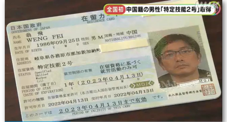 2022年4月13日,第一位获得日本“特定技能2号”资格的外国人是约10年前来到日本的中国籍的翁飞先生,他具有将混凝土均匀浇灌到建筑模具的熟练技能。他为了接家人来日本团聚而努力通过了技能考试。11月6日,克服了疫情管控等困难,翁飞的妻子抵达日本,夫妻终于在分离4年后在日本团聚了。