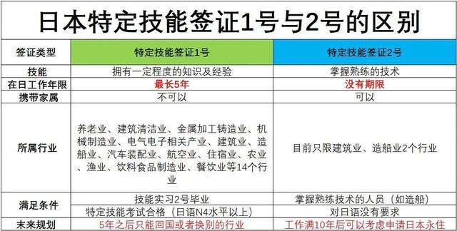 特定技能签证分为1号和2号,特定技能1号者通过考试即可以转为特定技能2号。持特定技能1号签证,在日本在留期限最多5年,可以自由转职,也有机会转为留学或人文技术签证。