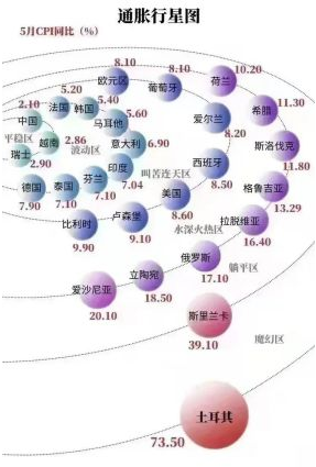 今年5月份全世界各国公布了CPI数据不久后,一张《通胀行星图》在网络上便不胫而走,全世界有不少国家都处于不同级别的通胀期。从图中可以看出,中国、越南、瑞士处于核心的平稳区,而斯里兰卡、土耳其则处于魔幻区。