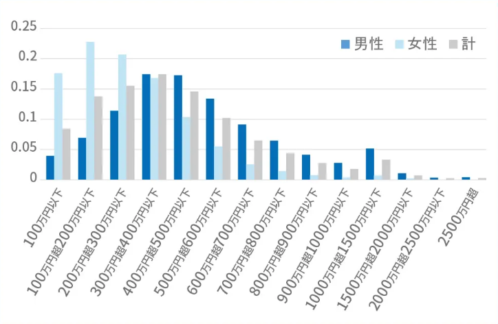 从性别分析,日本男性年收入平均值为532万日元、女性为292万日元。其中大多数男性的年收入在300-400万日元之间、大多数女性的年收入在100-200万日元之间。男性中55-59岁年龄段收入最高,为668万日元;女性中45-49岁年龄段收入最高,为458万日元。虽然男性收入普遍高于女性,但无论男女,学历越高则收入平均值越高。