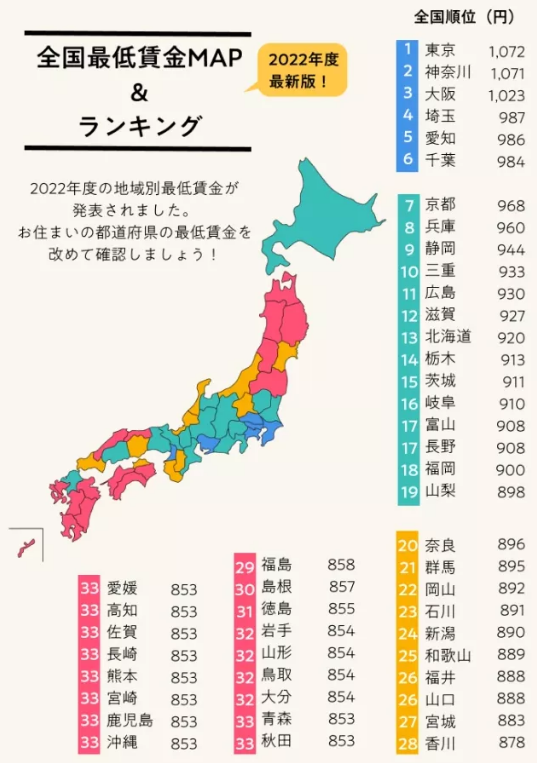 在日本,一些兼职工作或加班时间是按时薪结算收入,外国人与日本人同工同酬。根据2022年度的最新时薪标准,每小时东京最高为1072日元、神奈川县为1071日元、大阪府1023日元、埼玉县987日元、千叶县984日元、京都968日元。