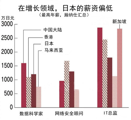 比如负责大数据分析的数据科学家,日本的年薪为1200万日元、中国则高达1600万日元;负责IT业务管理的“IT总监”,日本的年薪为1800万日元,而中国大陆、香港和新加坡均超过2000万日元。