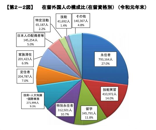 根据日本总务省发布的数据显示,在日外国人为274万7137人,约占日本总人口的2.2%。在日外国人中,人数最多的为中国籍,达到66万7475人(不包括日籍华人),在外国人总体人数中占比27.8%。