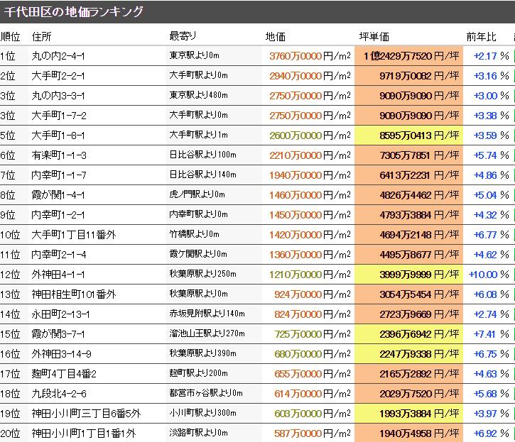 千代田区东北新干线沿线的平均地价48万2901日元/㎡、东海道新干线沿线的平均地价114万2670日元/㎡、JR东北本线沿线的平均地价38万4748日元/㎡、筑波快车沿线的平均地价100万3756日元/㎡、JR总武本线沿线的平均地价117万1755日元/㎡、JR京叶线沿线的平均地价164万8078日元/㎡、JR中央线(东京都内)沿线的平均地价154万5421日元/㎡、JR中央本线沿线的平均地价95万3846日元/㎡、JR山手线沿线的平均地价276万8568日元/㎡、JR东海道本线沿线的平均地价45万9381日元/㎡、JR京浜东北线沿线的平均地价117万5977日元/㎡、东京地铁有乐町线沿线的平均地价250万0312日元/㎡、东京地铁东西线沿线的平均地价210万7916日元/㎡、JR横须贺线沿线的平均地价145万2072日元/㎡。