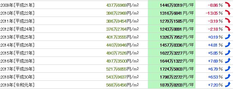 从1984年(昭和59年)开始有36年的数据,公示地价的最高值为1359万2857日元/㎡(1991年),最低值为266万6000日元/m2(2001年),双方的差异是5.10倍。 基准地价的最高值为1465万0000日元/㎡(1990年),最低值为209万8500日元/m2(2004年),两者的差异是6.98倍。