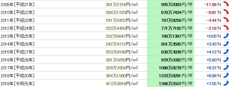 从1983年(昭和58年)开始的37年的数据,公示地价的最高价格是1179万5625日元/㎡(1991年),最低价格是209万6413日元/㎡(2001年),两者的差距是5.63倍。基准地价的最高价格是967万日元/㎡(1985年),最低价格是152万4444日元/㎡(2001年),两者的差距是6.34倍。