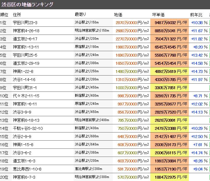 涉谷区内的基准点是JR埼京线、JR中央线(东京都内)、JR中央本线、JR山手线、湘南新宿线、东急田园都市线、东急东横线、京王线、京王井之头线、小田急小田原线到车站的距离越短,地价越高。