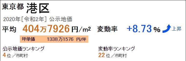 东京都港区的最新公示地价平米单价平均为404万7926日元/㎡(2020年令和2年),坪单价平均为1338万1576日元/坪,全国排名第4。从去年开始的变动率为+8.73%,变动率的全国排名是22位。