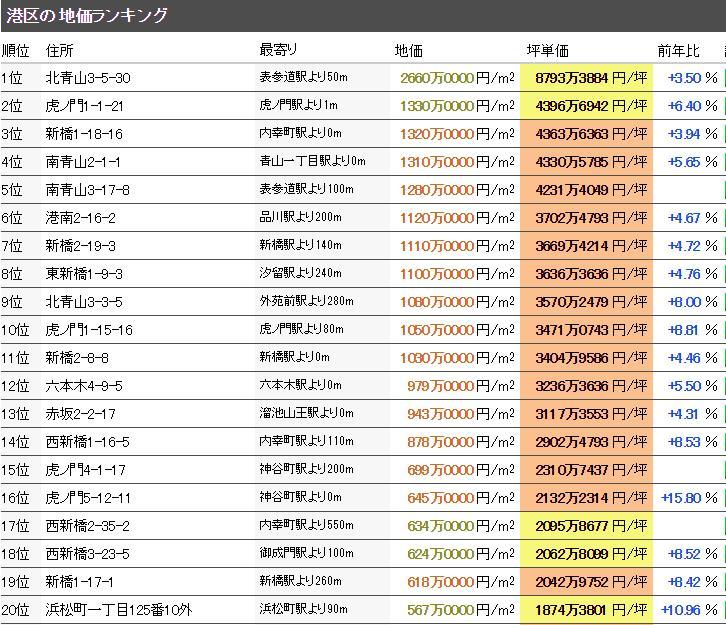 港区内的基准点是东海道新干线、JR山手线、JR东海道本线、JR京浜东北线、京急本线、JR横须贺线的线路越近地价越高。