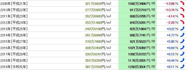 从1985年(昭和60年)开始35年的数据,公示地价的最高值是1119万2307日元/㎡(1991年),最低值是171万9322日元/㎡(2000年),两者的落差是6.51倍。基准地价的最高值是1209万8888日元/㎡(1988年),最小价格是158万4565日元/㎡(2004年),两者的落差是7.64倍。