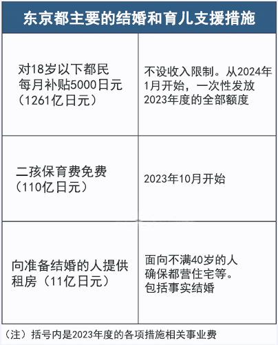 在2023年度的预算中,对于居住在东京都的家庭中,面向18岁以下的约200万都民每人每月补贴5000日元,总计约1261亿日元。原因是东京的育儿成本比其他地方每个月约高5000日元,这部分费用由东京都补贴,2024年1月将一次性补贴2023年度全年的费用。