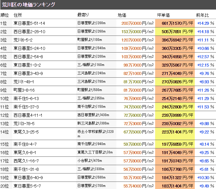 东京都荒川区内基准点的地价,有着距离JR东北本线、JR常磐线、筑波快车、京成本线、JR山手线、JR京浜东北线、日暮里・舍人线越近,土地价格越高的倾向。
