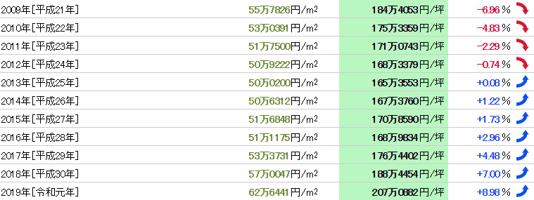 从1983年(昭和58年)开始37年的数据,公示地价的最高值是261万0000日元/㎡(1988年),最低价格是45万9882日元/㎡(2005年),两者的差异是5.68倍。基准地价的最高值是281万日元/㎡(1991年),最小价格是48万2600日元/㎡(2005年),两者的差异是5.82倍。