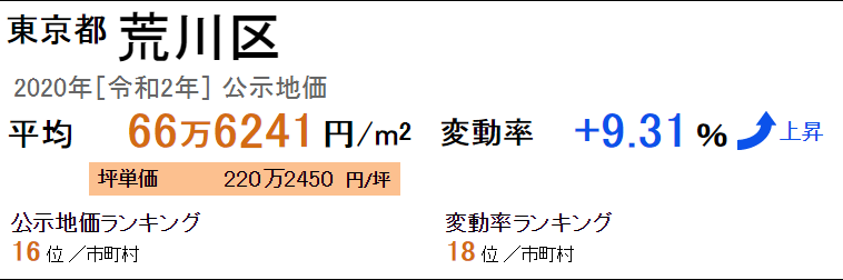 东京都荒川区最新公示地价平米单价平均为66万6241日元/㎡(2020年“令和2年”),坪单价平均为220万2450日元/坪,全国排名第16位。从去年开始的变动率是+9.31%,变动率的全国排名是18位。