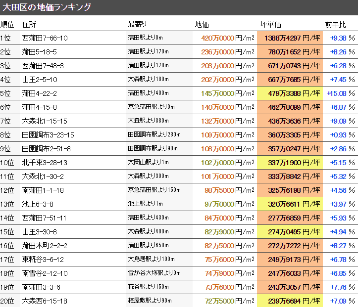 东京都大田区的最高地价地点是“大田区西蒲田7-66-10”(420万日元/㎡),最低地价地点是“大田区城南岛2-9-15”(26万5000日元/㎡)。