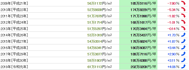 从1983年(昭和58年)开始37年的数据,公示地价的最高值是200万5526日元/㎡(1991年),最低值是52万2045日元/㎡(2001年),两者的落差是3.84倍。基准地价的最高值是164万4157日元/㎡(1990年),最低价格是43万5482日元/㎡(2005年),两者的落差是3.78倍。