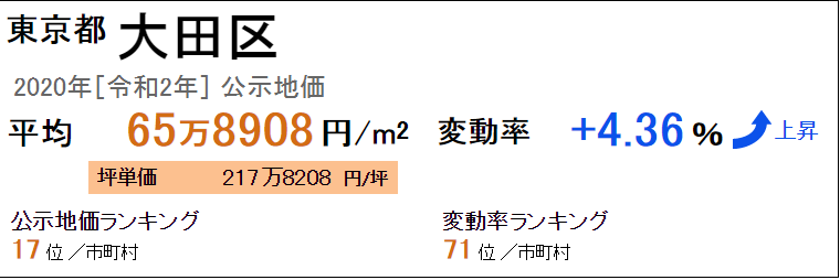 东京都大田区最新公示地价平米单价平均为65万8908日元/㎡(2020年“令和2年”),坪单价平均为217万8208日元/坪,全国排名第17位。从去年开始的变动率是+4.36%,变动率的全国排名是71位。