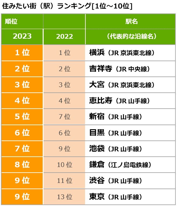 首先,我们来介绍一下2023年想居住的车站排名结果: "横滨"夺得第一名、"吉祥寺"保持第二名,去年位列第三的"大宫"保持原位置,"惠比寿"坚守第四名、TOP4和2022年一样。
