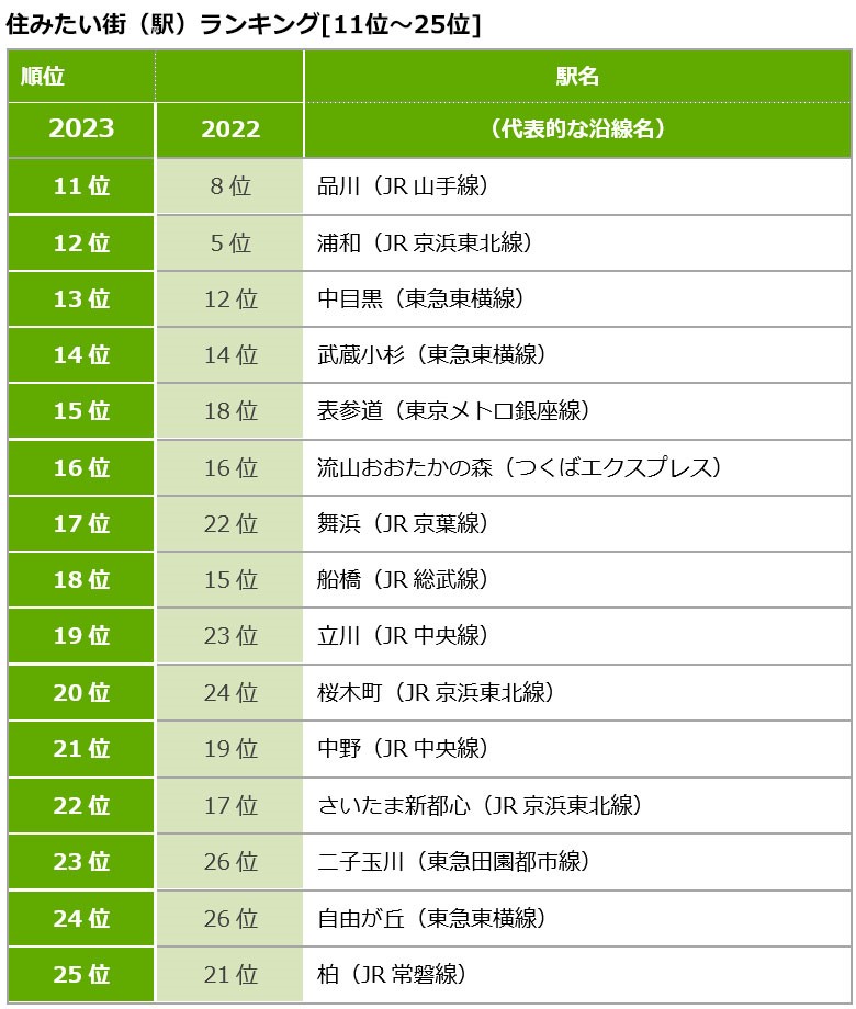 此外,如果看一下11至25名,虽然上榜的车站相似,但排名还是有所微调。市中心的品川和表参道等车站的排名有所下降,而舞浜、船桥和立川等市郊受欢迎的车站则提高了排名。市中心低迷和市郊上升的趋势是2022年曾出现过的现象,因此,在新冠疫情期间,人们似乎更愿意去评估并居住在他们所在城市周边的区域。