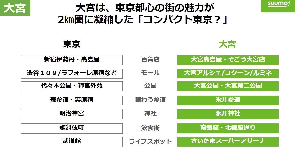至于大宫,池本先生表示,它是一个年轻人感到有吸引力的街区,商业设施围绕车站周围开设了许多只有东京才有的店。此外,从拥有冰川神社的大宫公园到连接到COCOON CITY的“冰川参道”周围也很活跃。沿街树排列着各具特色的商店,周围还毗邻有客流量大的“Saitama Super Arena”和“NACK5 Stadium Omiya”等设施。车站周围还有许多餐馆。这使得它看起来像是一个紧凑的东京。