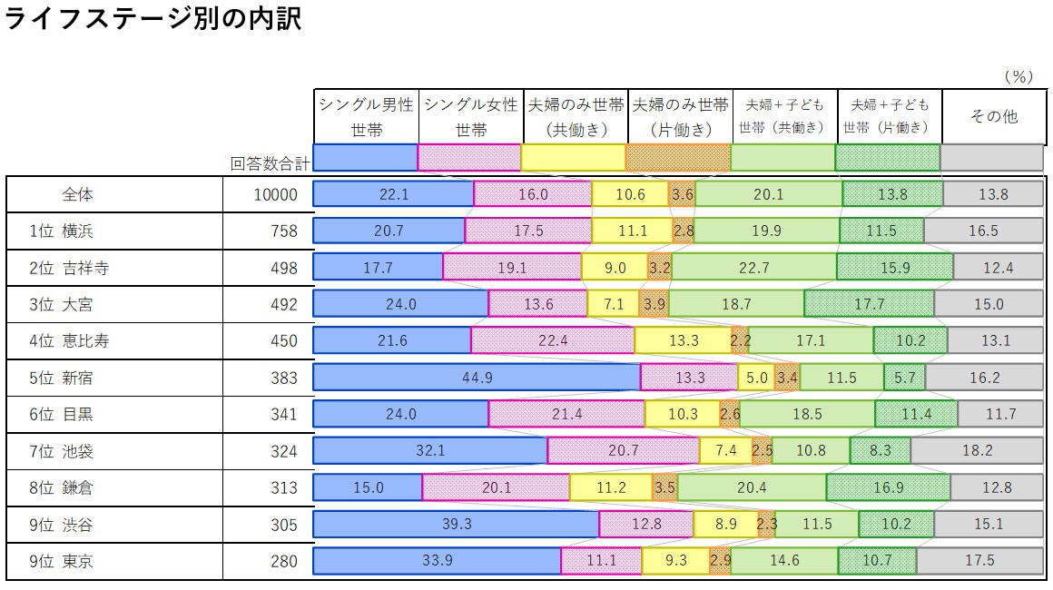 接下来,让我们关注一下「新宿」。它在2023年取得了显著的进步,跻身进了前五名,而推动其进步的原动力是「单身男性」。从生活阶段的分析来看,在投票给新宿的人中,单身男性占44.9%。与第一名的横滨22.1%、第二名的吉祥寺20.7%和第三名的大宫24.0%相比,新宿单身男性的份额显著高出许多。