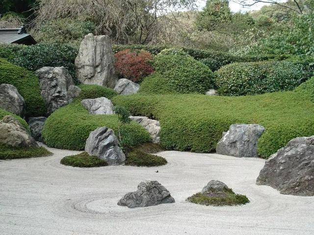 日本的庭院设计极其讲究,主旨突出大奢至简、道法自然,更注重禅修的意境。主要元素包括主题植物、岩石、砂砾、石灯笼以及水系等。