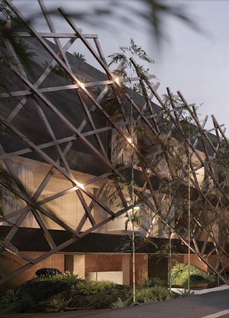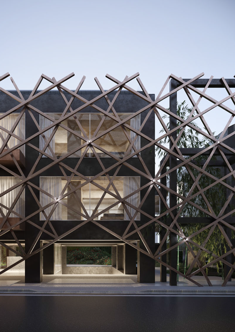 项目保留了中庭的园林景观,为了与庭院相呼应,整个建筑的外围使用了日本竹子和格子的元素,从外观就可以感觉到大自然包裹着整个建筑,仿佛逃离了城市的喧嚣,生活在大自然之中,并融入其间的美好。有人说青山雅筑远看像中国的鸟巢一样,外观大气、新颖,近看又如蚕茧一般,细腻、艺术。