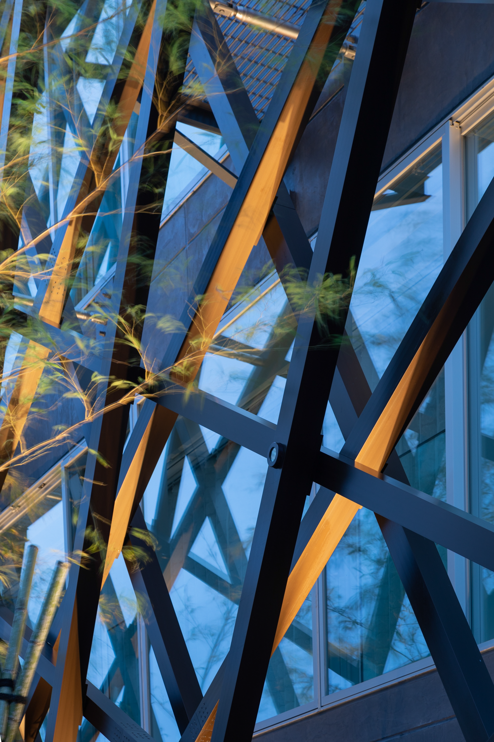 和普通的建筑只是部分使用格子元素有所不同,青山雅筑的建筑外观大面积地使用了交错的格栅,将建筑本体与外面的道路之间隔离出来一条内部便道,且使两栋建筑融为一体,毫无违和感,从整体外观看起来更是形成了统一的连续感。格栅外还种植了翠竹,竹子也是日本建筑的传统元素,竹叶随风舞动,与静态的格栅动静相宜。同时建筑的墙壁也大面积地使用了落地玻璃,格栅与竹子在日光的照应下,投影在玻璃幕墙更具有幻影感,虚实结合更呈现出梦幻的光影效果。