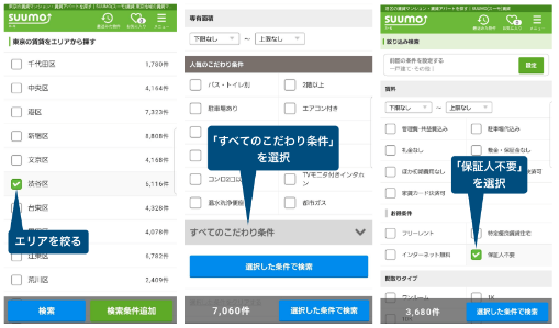 想找到无需保证人或保证会社的房子时,可以请房屋中介帮忙推荐合适的房源,或者在homes或suumo等租房网站上搜索,勾选相应的租房条件即可。