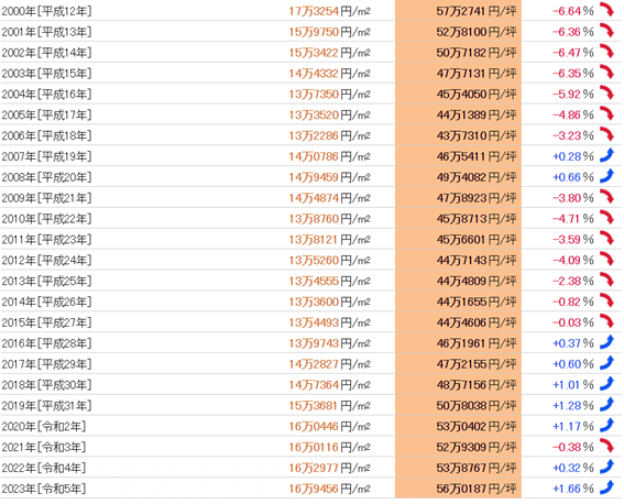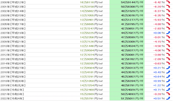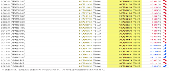 从1983年(昭和58年)开始共40年的数据来看,公示地价的最高值是每平方米39,331日元(1991年),最低值是每平方米13,286日元(2006年),两者之间的差异是3.02倍。基准地价的最高值是每平方米36,8325日元(1991年),最低值是每平方米11,3288日元(2012年),两者之间的差异是3.25倍。