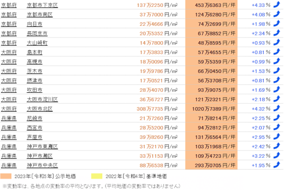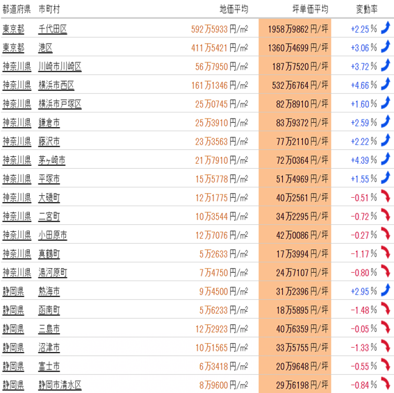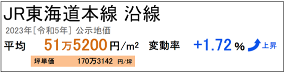 JR东海道本线沿线的公示地价平均为每平方米51.52万日元(2023年),每坪大约为平均170.3142万日元,与去年相比变动率为+1.72%。