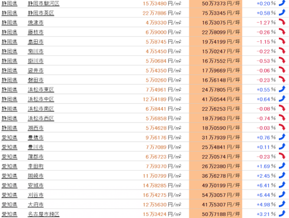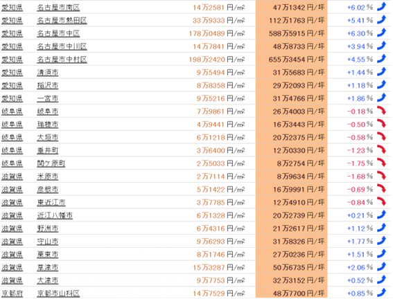 我们根据公示地价和基准地价计算厨了铁路沿线的土地价格。沿线的定义为铁路线路沿途的市区町村,JR东海道本线沿线的相应城市包括:东京都千代田区、港区;神奈川县川崎市川崎区;神奈川县横滨市西区、戸塚区;神奈川县镰仓市;神奈川县藤泽市;神奈川县茅崎市;神奈川县平冢市;神奈川县中郡大磯町、二宫町;神奈川县小田原市;神奈川县足柄下郡真鹤町、湯河原町;静冈县热海市;静冈县田方郡函南町;静冈县三岛市;静冈县沼津市;静冈县富士市;静冈县静冈市清水区、駿河区、葵区;静冈县焼津市;静冈县藤枝市;静冈县岛田市;静冈县菊川市;静冈县掛川市;静冈县袋井市;静冈县磐田市;静冈县浜松市东区、中区、南区、西区;静冈县湖西市;爱知县丰桥市;爱知县丰川市;爱知县蒲郡市;爱知县额田郡幸田町;爱知县冈崎市;爱知县安城市;爱知县刈谷市;爱知县大府市;爱知县名古屋市绿区、南区、热田区、中区、中川区、中村区;爱知县清须市;爱知县稻沢市;爱知县一宫市;岐阜县岐阜市;岐阜县瑞穗市;岐阜县大垣市;岐阜县不破郡关原町;滋贺县米原市;滋贺县彦根市;滋贺县东近江市;滋贺县近江八幡市;滋贺县野洲市;滋贺县守山市;滋贺县栗东市;滋贺县草津市;滋贺县大津市;京都府京都市山科区、下京区、南区;京都府向日市;京都府长岡京市;京都府乙训郡大山崎町;大阪府三岛郡岛本町;大阪府高槻市;大阪府茨木市;大阪府摄津市;大阪府吹田市;大阪府大阪市淀川区、北区;兵库县尼崎市;兵库县西宫市;兵库县芦屋市;兵库县神户市东灘区;兵库县神户市灘区;兵库县神户市中央区。