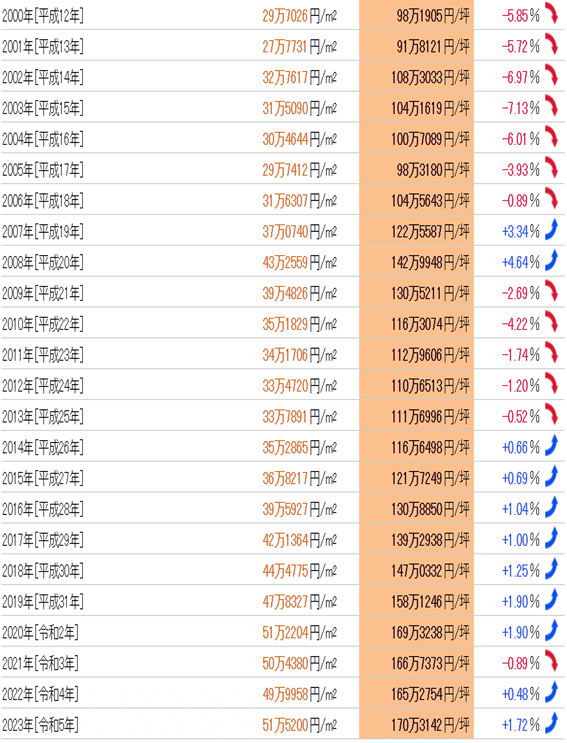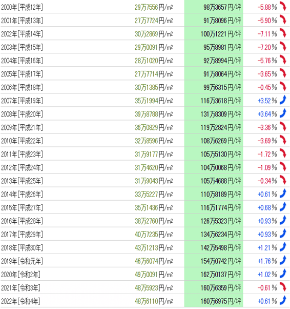基准地价平均为每平方米46.2007万日元(2022年),每坪大约是平均152.7297万日元,与前一年相比变动率为+0.83%。