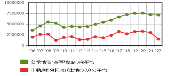 日本国土交通省计算了东京中央区仅包括土地的不动产交易的平均价格,不包括建筑物。由于这些价格是基于实际交易而计算的,因此它们接近于实际市场价格。2022年第一季度(令和4年),中央区土地交易的平均价格是每平方米1500万日元,每坪4958.667万日元(约合3.3平方米),同比下降了50.06%。平均交易价格比上述公告土地价格和参考土地价格的平均价格低了78.86%。