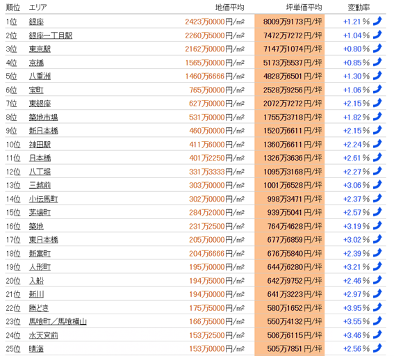 中央区的最高价地点是“中央区银座4-5-6”(5380万0000日元/平方米),最低价地点是“中央区日本桥浜町2-46-3”(84万4000日元/平方米)。