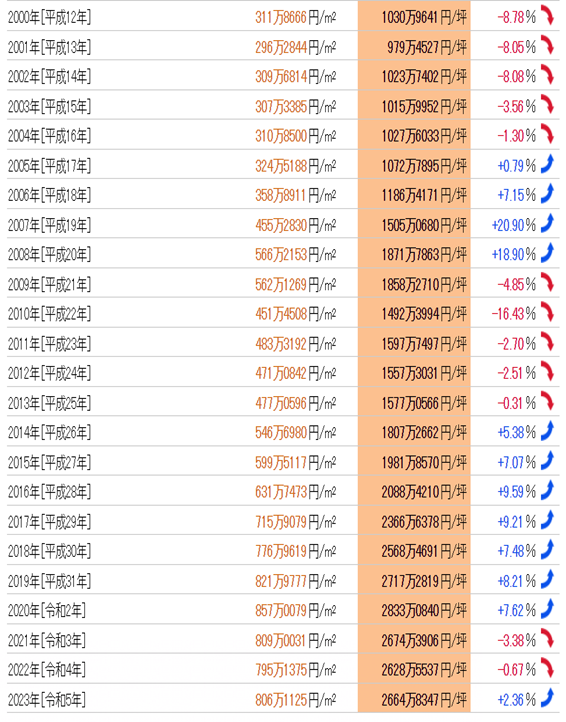 住宅地的平均地价为131万1153日元/平方米,坪单价为433万4392日元/坪,涨幅为+3.13%(2022年)。商业地的平均地价为808万4543日元/平方米,坪单价为2672万5762日元/坪,涨幅为-3.40%(2022年)。