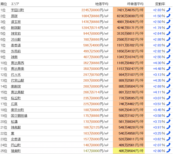涩谷区2022年(令和4年)最新的标准地价是每平方米4,062,607日元,或每坪13,430,106日元,排名日本全国第四。年同比增长率为+1.81%,日本全国排名第159。