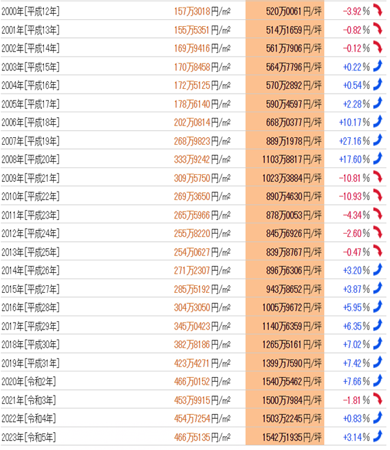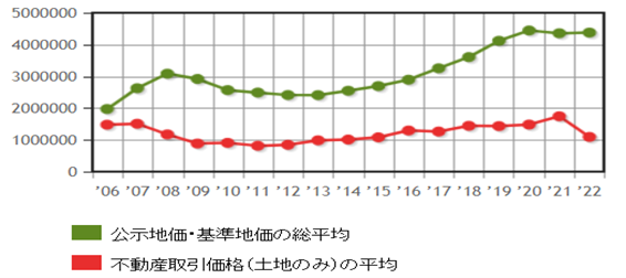 在实际进行的不动产交易价格(由国土交通省发布)中,我们仅筛选出不包含建筑物(如大楼、房屋)的土地交易,并计算出平均价格。这些交易的价格是实际进行的不动产交易价格,因此可以近似地反映市场价格。在2022年(令和4年)第1季度,涩谷区的土地交易价格为每平方米110万7500日元,每坪366万1157日元,同比下降36.97%。这个平均交易价格与上述公示地价和基准地价的平均数相比,差距为-74.78%。