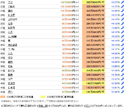 同时2022年(令和4年)发布的最新基准地价显示,台东区最新的标准地价为平均每平方米151万4555日元(截至2022年(令和4年)),每坪平均价格为500万6795日元,日本全国排名第7。与前一年相比涨幅为2.64%,涨幅在日本全国排名第104位。